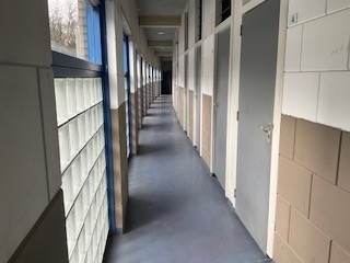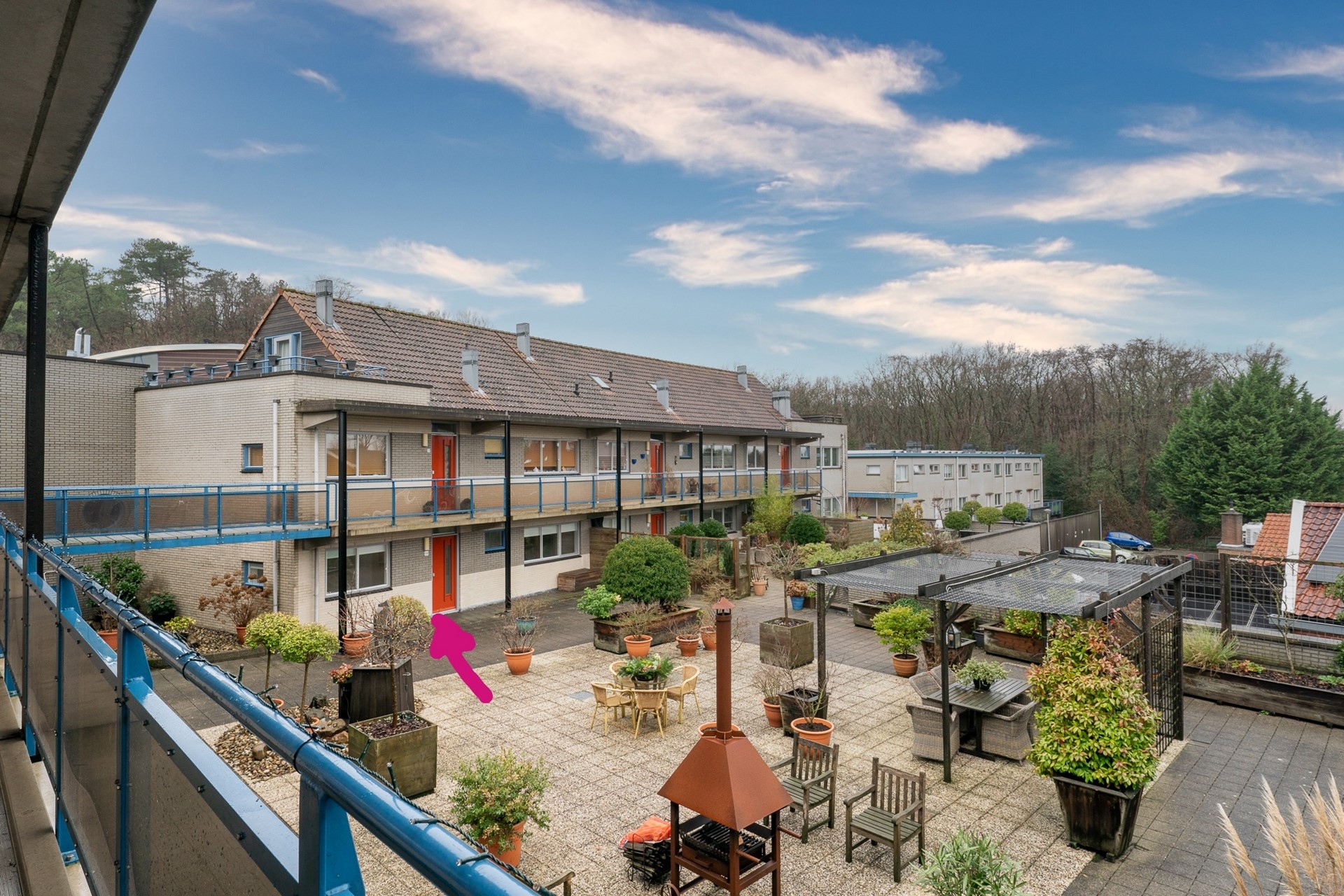 Eerste verdieping ; de voordeur van het appartement is gesitueerd aan de binnenzijde van het complex aan de gezamenlijke binnentuin/terras.